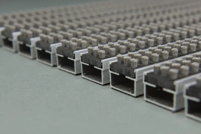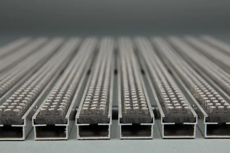 Die Ausführung mit Cassettenbürsteneinlage der Eingangsmatte Diplomat eignet sich ideal für die Entfernung von gröberem Schmutz unter den Schuhsohlen, Rädern o.ä; die Borsten der Cassettenbürsten gelangen aber auch gut in Profile von Schuhen, Rädern etc. und entfernen so auch Feinschmutzpartikel besonders gründlich.