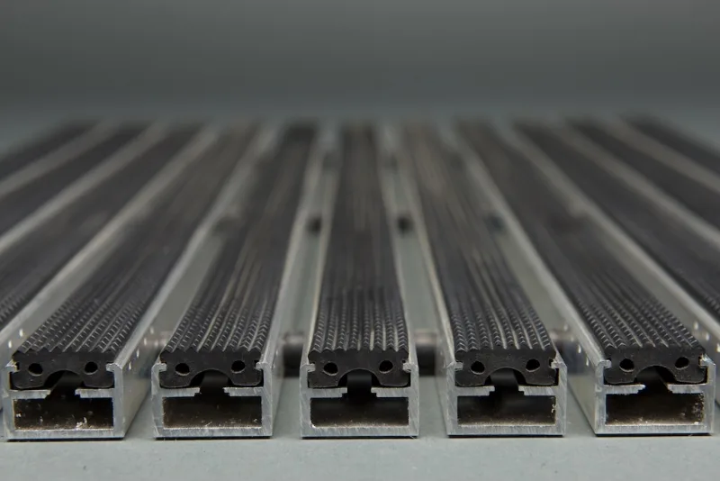 Die Ausführung mit Gummieinlage der Eingangsmatte Diplomat eignet sich besonders gut für die Entfernung von gröberem Schmutz unter den Schuhsohlen, Rädern o.ä. Durch die leichte Strukturierung des Gummis werden auch Feinschmutzpartikel entfernt.