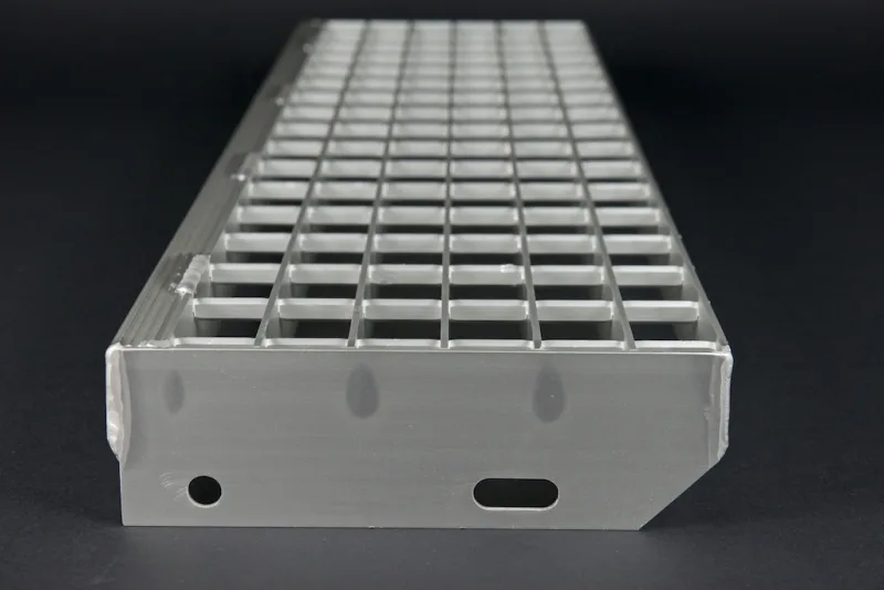 Tragstab und Füllstab/Querstab werden bei der Aluminium Gitterrost Treppenstufe durch Hochdruck Vertikalpressung dauerhaft miteinander verbunden. Die Aluminium Gitterrost Treppenstufe verfügt über eine profilierte Antrittskante zur Erhöhung der Sicherheit und Trittfestigkeit.