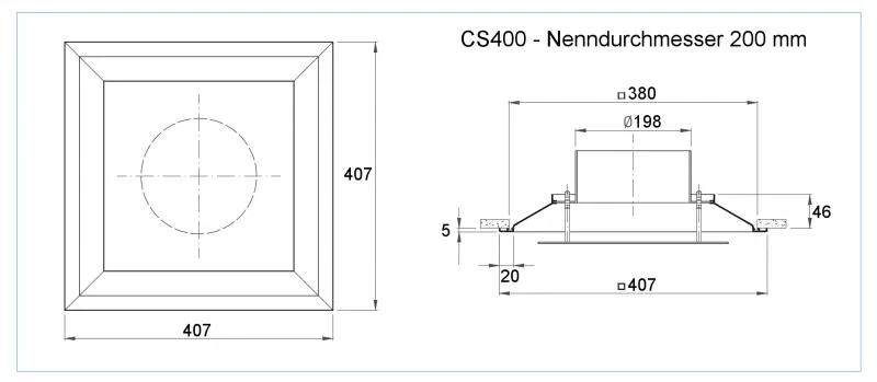 - Anschlusskasten (DP150S): Die verschiedene Anschlusskästen (variieren im Ø) können hier als separates Zubehör für die Deckenluftdurchlässe CS400 ausgewählt werden. Entscheidend hierbei sind lediglich die Maße der Deckenöffnung. Alle Anschlusskästen passen zu den diversen Deckenluftdurchlässen für die angegebene Größe.