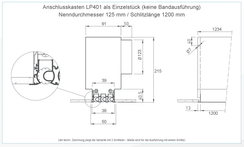 - Anschlusskasten (LP402M): Der Anschlusskasten LP402M für das Lüftungsgitter / Schlitzdurchlass LT452M muss separat bestellt, bzw. mittels Konfigurator ausgewählt werden. Bis 1600 mm verfügt der Anschlusskasten über einen Anschlussstutzen, ab 1600 mm über 2 Anschlussstutzen. Eine isolierte Ausführung, sowie eine Mengenregulierung sind auf Anfrage möglich.