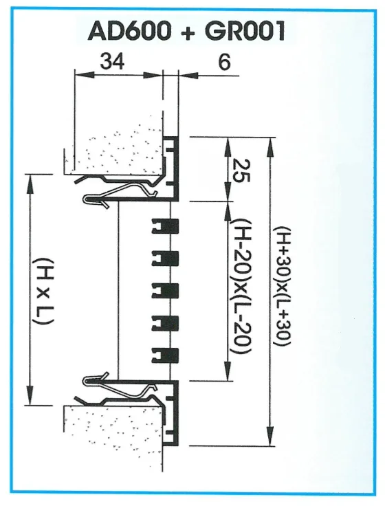 . - Montagerahmen (GR001): Der Montagerahmen ist notwendig, um das Lüftungsgitter AD600 ordnungsgemäß in der Wand zu montieren. Der Montagerahmen wird zunächst in der Wand fixiert und das Lüftungsgitter anschließend einfach mittels Klemmfedern eingesetzt und kann dementsprechend auch ohne großen Aufwand zur Wartung demontiert werden. (Der Montagerahmen muss separat bestellt werden, bzw. mittels Konfigurator ausgewählt werden).