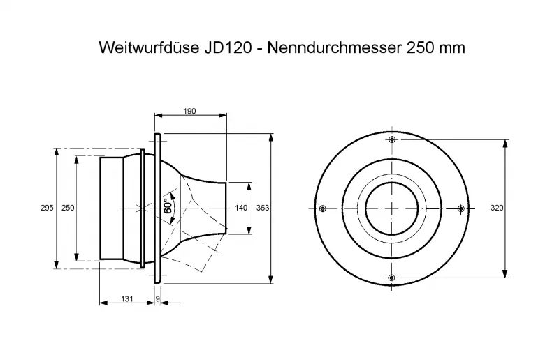 Die Weitwurfdüse JD120 eignet sich für die Zufuhr von gekühlter oder erwärmter Luft in großen / hohen Räumen und Hallen. Die Weitwurfdüse ist für die Wandmontage vorgesehen und eignet sich auch für den Anschluss an ein Flexrohr. Die in jede Richtung schwenkbare Düse ermöglicht eine hohe Variabilität in der Strahllenkung. Die Düse kann horizontal wie vertikal um 30° in jede Richtung geneigt werden (zusammen je 60° Schwenkradius). Zudem eignen sich die Weitwurfdüsen für große Wurfweiten.